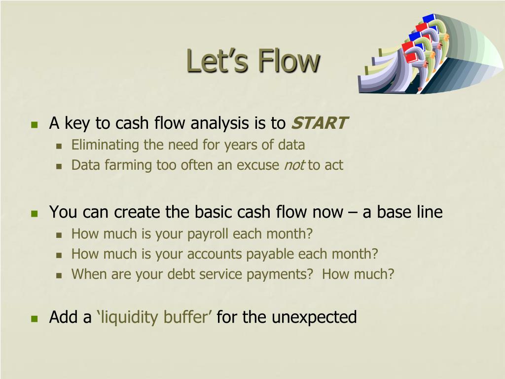 Let’s Flow • A key to cash flow analysis is to START • Eliminating the need for years of data • Data farming too often an excuse not to act • You can create the basic cash flow now – a base line • How much is your payroll each month? • How much is your accounts payable each month? • When are your debt service payments? How much? • Add a ‘liquidity buffer’ for the unexpected