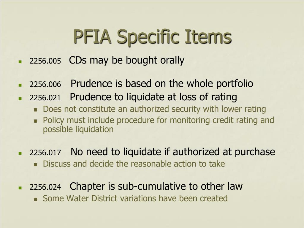 PFIA Specific Items • 2256.005 CDs may be bought orally • 2256.006 Prudence is based on the whole portfolio • 2256.021 Prudence to liquidate at loss of rating • Does not constitute an authorized security with lower rating • Policy must include procedure for monitoring credit rating and possible liquidation • 2256.017 No need to liquidate if authorized at purchase • Discuss and decide the reasonable action to take • 2256.024 Chapter is sub-cumulative to other law • Some Water District variations have been created