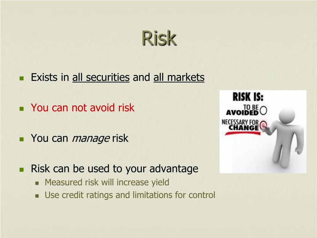 Risk • Exists in all securities and all markets • You can not avoid risk • You can manage risk • Risk can be used to your advantage • Measured risk will increase yield • Use credit ratings and limitations for control