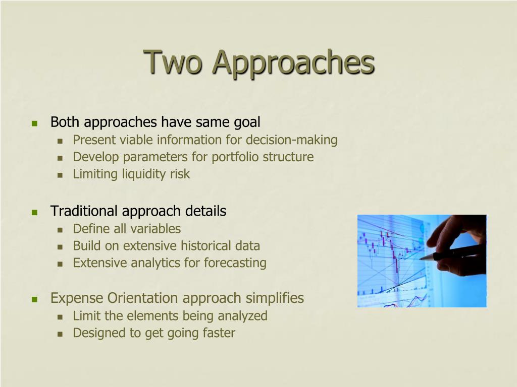Two Approaches • Both approaches have same goal • Present viable information for decision-making • Develop parameters for portfolio structure • Limiting liquidity risk • Traditional approach details • Define all variables • Build on extensive historical data • Extensive analytics for forecasting • Expense Orientation approach simplifies • Limit the elements being analyzed • Designed to get going faster