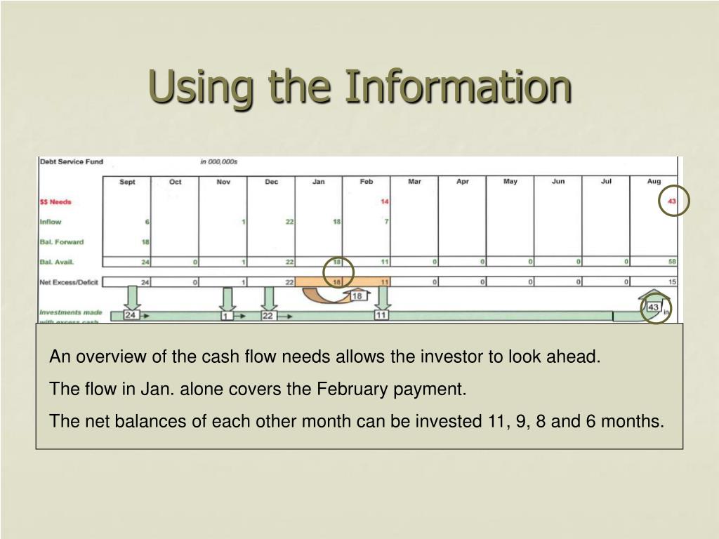 Using the Information An overview of the cash flow needs allows the investor to look ahead. The flow in Jan. alone covers the February payment. The net balances of each other month can be invested 11, 9, 8 and 6 months.