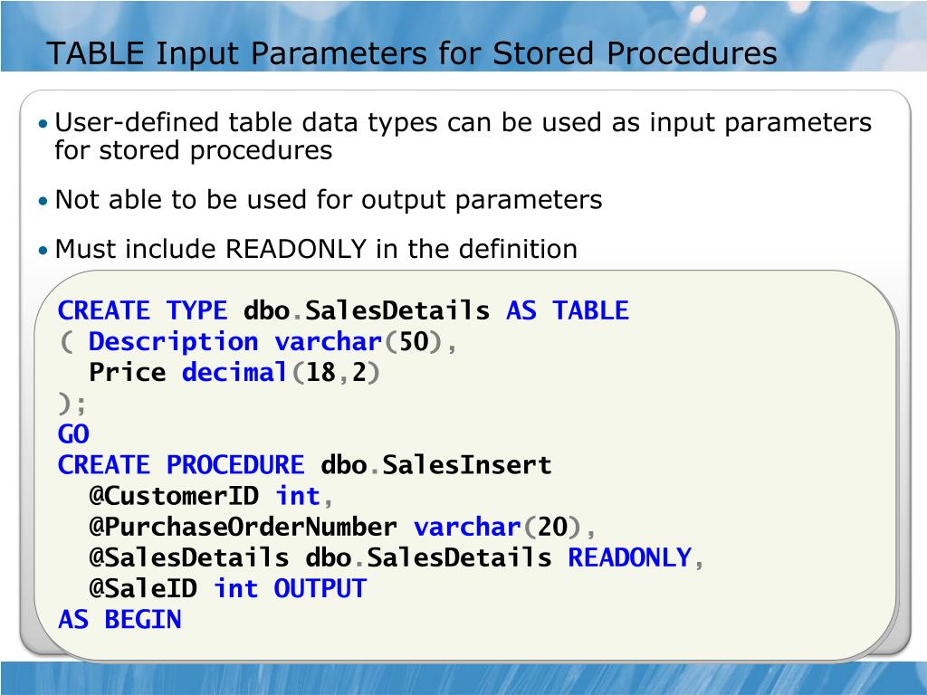 Introduction to the TABLE Type • Earlier versions of SQL Server allowed variables to be of type TABLE and to allow definition of the structure of the table • SQL Server allows the creation of table data type definitions • Can be used for variables • Can be used for parameters CREATETYPEdbo.CustomerBalance ASTABLE (CustomerIDint, CurrentBalancedecimal(18,2)); GO