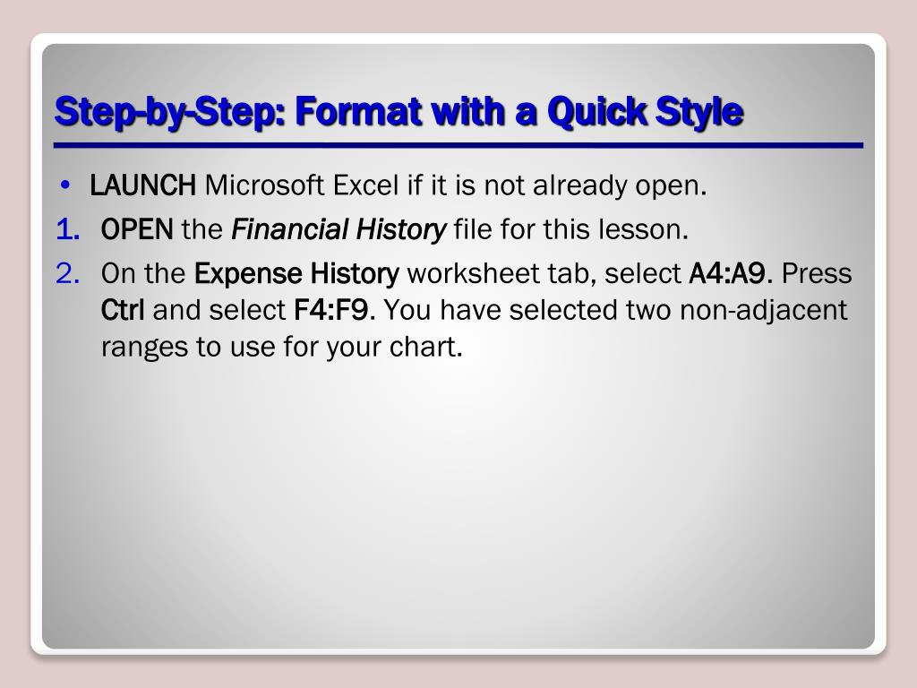 Step-by-Step: Format with a Quick Style • LAUNCH Microsoft Excel if it is not already open. • OPEN the Financial History file for this lesson. • On the Expense History worksheet tab, select A4:A9. Press Ctrl and select F4:F9. You have selected two non-adjacent ranges to use for your chart.