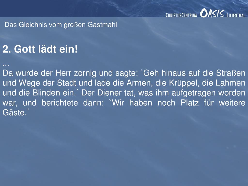 Das Gleichnis vom großen Gastmahl 2. Gott lädt ein! ... Da wurde der Herr zornig und sagte: `Geh hinaus auf die Straßen und Wege der Stadt und lade die Armen, die Krüppel, die Lahmen und die Blinden ein.´ Der Diener tat, was ihm aufgetragen worden war, und berichtete dann: `Wir haben noch Platz für weitere Gäste.´
