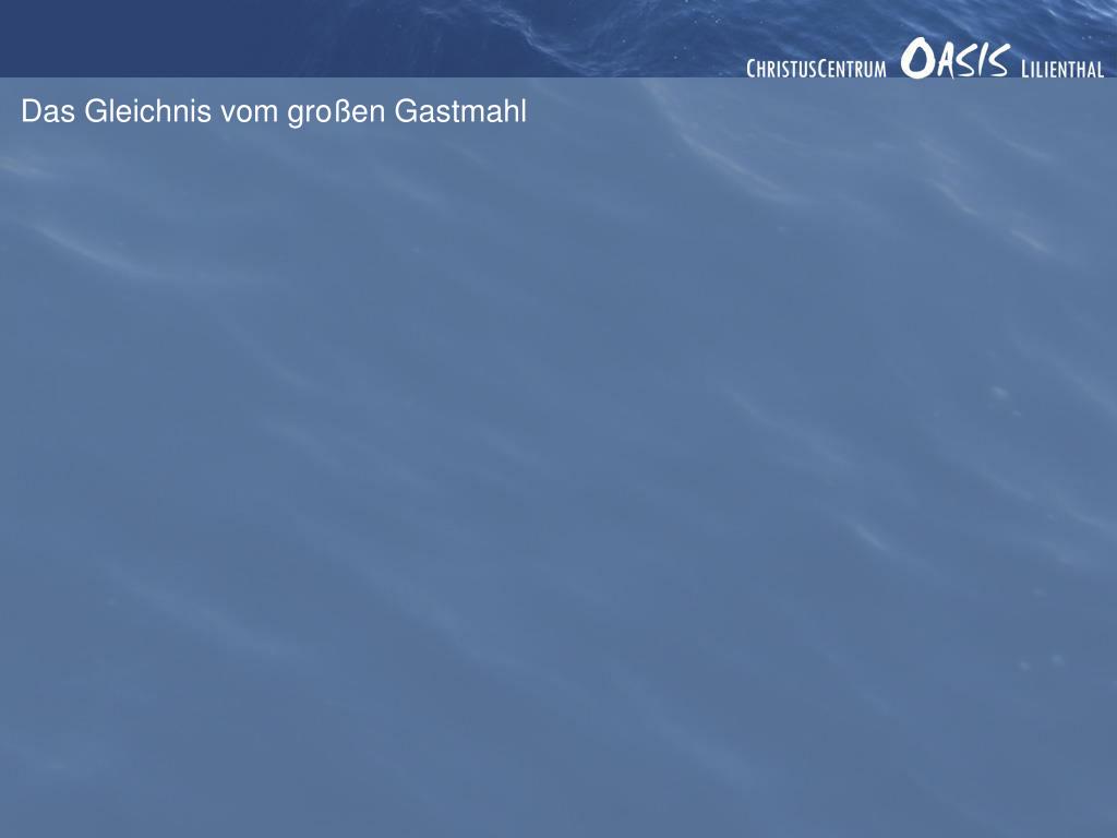 Das Gleichnis vom großen Gastmahl 1. Die Vorgeschichte des Gleichnisses Als ein Mann, der mit Jesus am Tisch saß, das hörte, rief er aus: »Gesegnet sind die, die am Festessen im Reich Gottes teilnehmen!«