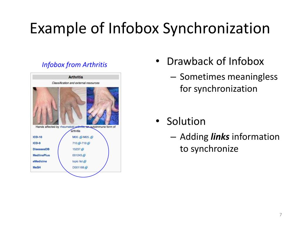 Example of Infobox Synchronization • Drawback of Infobox • Sometimes meaningless for synchronization • Solution • Adding links information to synchronize Infobox from Arthritis
