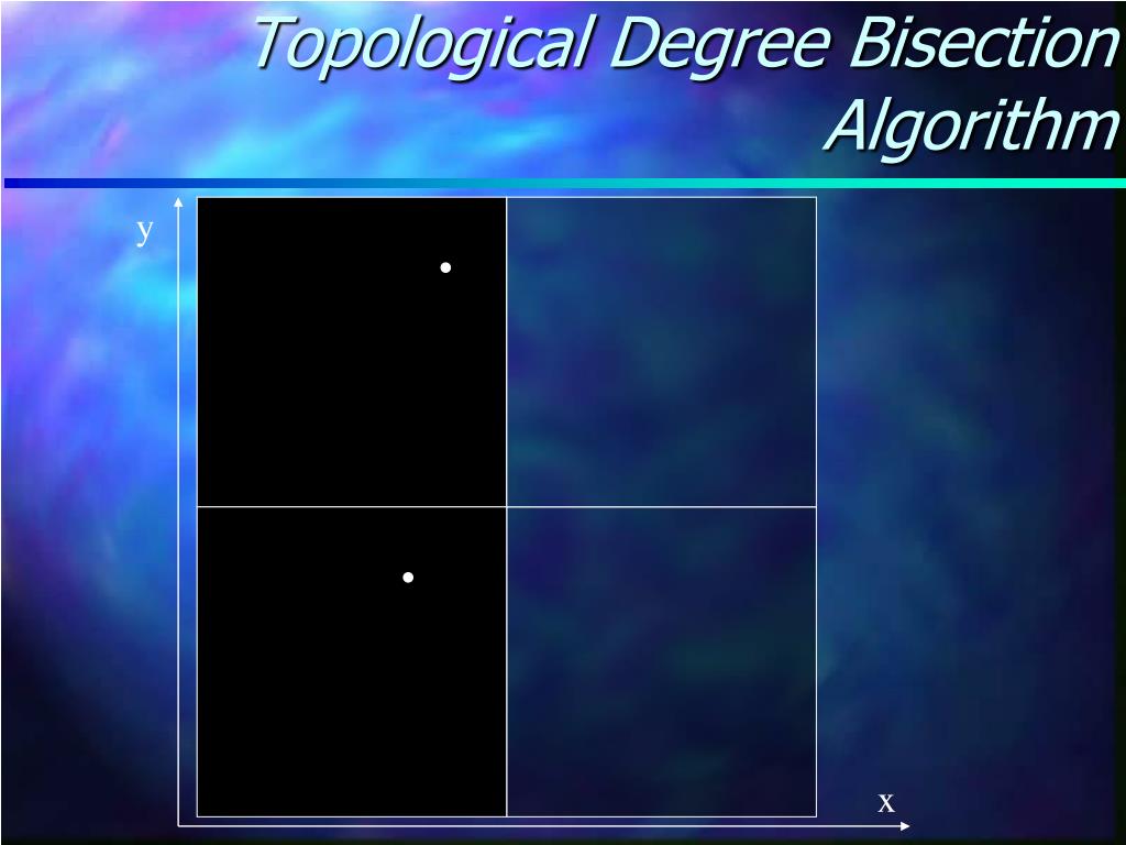 Univariate Polynomial Equation • Assume that we have a univariate polynomial equation f(t) = 0. • Substitute t with z = x + iy. Then we have f(z) = p(x,y) + iq(x,y). • Solve f(z)=0 in the complex domain based on the topological degree algorithm. • F(x,y) = (p(x,y),q(x,y)). • We can find not only real but also complex roots of f(t)=0 at the same time using the bisection algorithm.