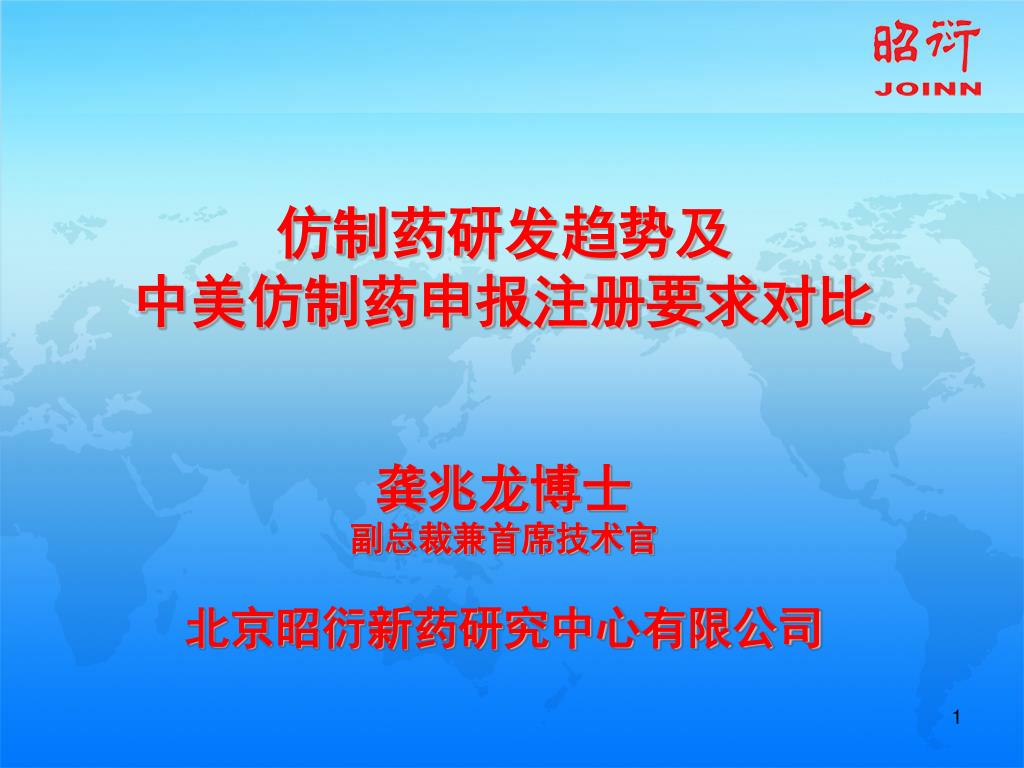 仿制药研发趋势及 中美仿制药申报注册要求对比 龚兆龙博士 副总裁兼首席技术官 北京昭衍新药研究中心有限公司