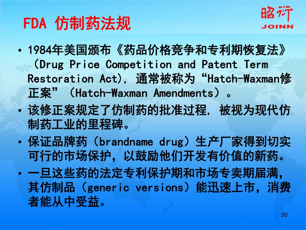 FDA 仿制药法规 • 1984年美国颁布《药品价格竞争和专利期恢复法》(Drug PriceCompetition and Patent Term Restoration Act), 通常被称为“Hatch-Waxman修正案”(Hatch-Waxman Amendments)。 • 该修正案规定了仿制药的批准过程, 被视为现代仿制药工业的里程碑。 • 保证品牌药(brandname drug)生产厂家得到切实可行的市场保护,以鼓励他们开发有价值的新药。 • 一旦这些药的法定专利保护期和市场专卖期届满,其仿制品(genericversions)能迅速上市,消费者能从中受益。