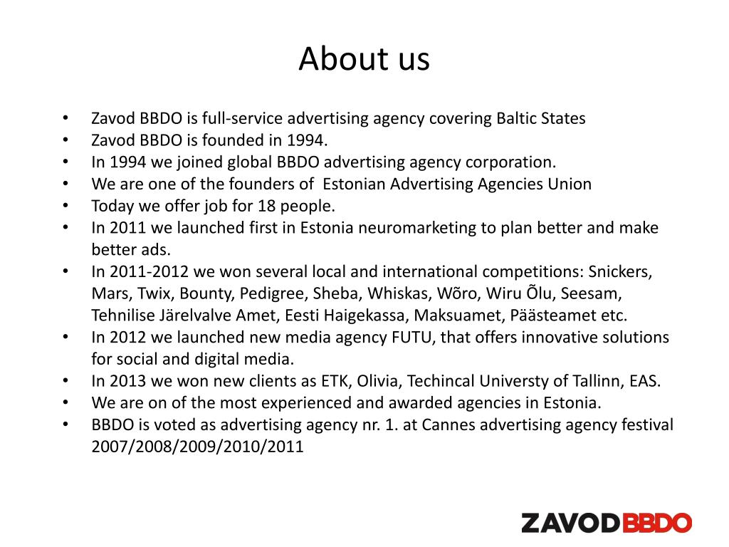 About us • Zavod BBDO is full-service advertising agency covering Baltic States • Zavod BBDO is founded in 1994. • In 1994 we joined global BBDO advertising agency corporation. • We are one of the founders of Estonian Advertising Agencies Union • Today we offer job for 18 people. • In 2011 we launched first in Estonia neuromarketing to plan better and make better ads. • In 2011-2012 we won several local and international competitions: Snickers, Mars, Twix, Bounty, Pedigree, Sheba, Whiskas, Wõro, Wiru Õlu, Seesam, Tehnilise Järelvalve Amet, Eesti Haigekassa, Maksuamet, Päästeamet etc. • In 2012 we launched new media agency FUTU, that offers innovative solutions for social and digital media. • In 2013 we won new clients as ETK, Olivia, Techincal Universty of Tallinn, EAS. • We are on of the most experienced and awarded agencies in Estonia. • BBDO is voted as advertising agency nr. 1. at Cannes advertising agency festival 2007/2008/2009/2010/2011