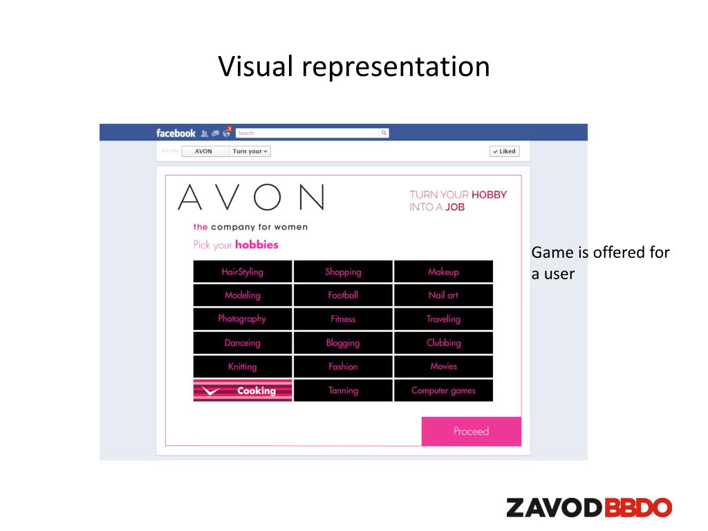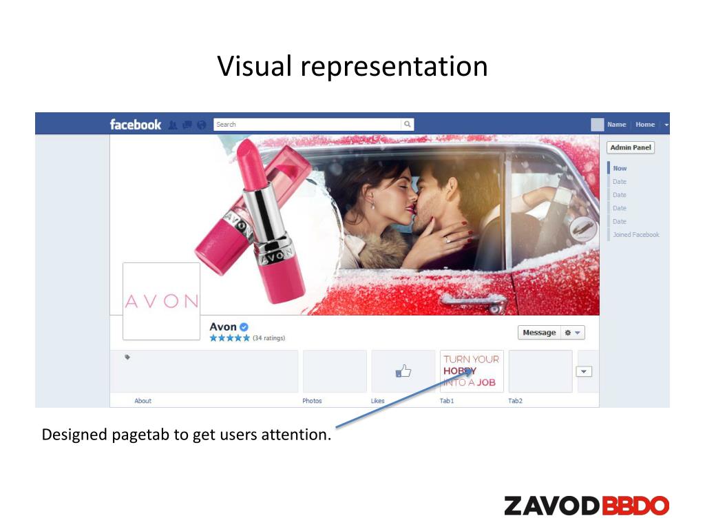 Facebook/Drugiem campaign use case • User notices a teasing phrase „Sales Director Wanted!“ with relevant picture as Facebook banner between other posts. • User clicks on a banner and will be directed into a landigpage. Landingpage is located under Avon Fanpage as separate pagetab. • Pagetab contains the same teasing text and list of different hobbies there, which user can choose from. • After answering some questions the result will be shown – „Welcome to our team. You are going to be a perfect sales director in Avon“ • User female friendlist will be provided with the total sum of money to be earn within next year. • Apply to become Avons representative here – goes to Avon landing page and starts filling the job application form.