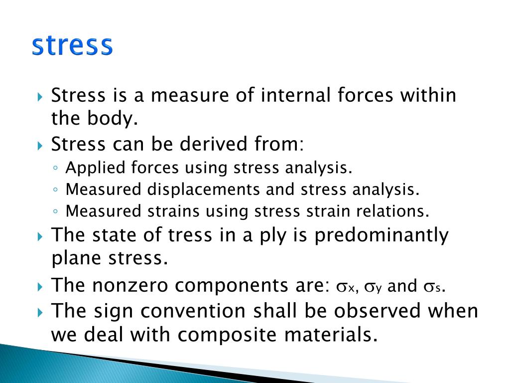 stress • Stress is a measure of internal forces within the body. • Stress can be derived from: • Applied forces using stress analysis. • Measured displacements and stress analysis. • Measured strains using stress strain relations. • The state of tress in a ply is predominantly plane stress. • The nonzero components are: sx, sy and ss. • The sign convention shall be observed when we deal with composite materials.