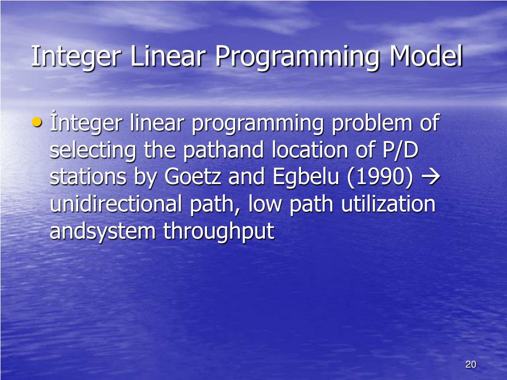 Integer Linear Programming Model • İnteger linear programming problem of selecting the pathand location of P/D stations by Goetz and Egbelu (1990) unidirectional path, low path utilization andsystem throughput