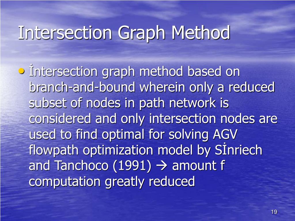 Intersection Graph Method • İntersection graph method based on branch-and-bound wherein only a reduced subset of nodes in path network is considered and only intersection nodes are used to find optimal for solving AGV flowpath optimization model by Sİnriech and Tanchoco (1991) amount f computation greatly reduced