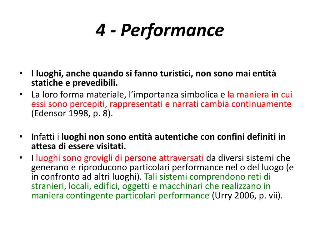 4 - Performance • I luoghi, anche quando si fanno turistici, non sono mai entità statiche e prevedibili. • La loro forma materiale, l’importanza simbolica e la maniera in cui essi sono percepiti, rappresentati e narrati cambia continuamente (Edensor 1998, p. 8). • Infatti i luoghi non sono entità autentiche con confini definiti in attesa di essere visitati. • I luoghi sono grovigli di persone attraversati da diversi sistemi che generano e riproducono particolari performance nel o del luogo (e in confronto ad altri luoghi). Tali sistemi comprendono reti di stranieri, locali, edifici, oggetti e macchinari che realizzano in maniera contingente particolari performance (Urry 2006, p. vii).
