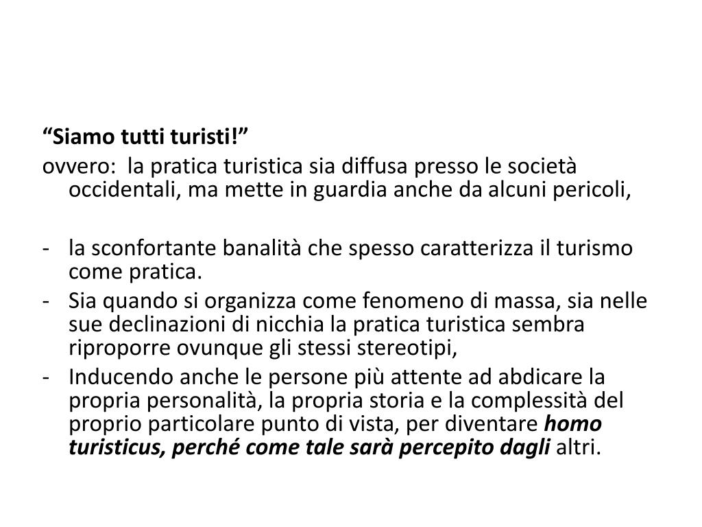 “Siamo tutti turisti!” ovvero: la pratica turistica sia diffusa presso le società occidentali, ma mette in guardia anche da alcuni pericoli, • la sconfortante banalità che spesso caratterizza il turismo come pratica. • Sia quando si organizza come fenomeno di massa, sia nelle sue declinazioni di nicchia la pratica turistica sembra riproporre ovunque gli stessi stereotipi, • Inducendo anche le persone più attente ad abdicare la propria personalità, la propria storia e la complessità del proprio particolare punto di vista, per diventare homo turisticus, perché come tale sarà percepito dagli altri.