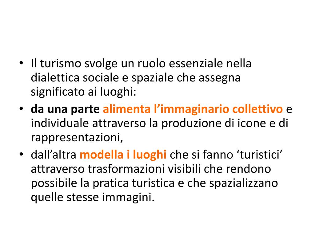 Il turismo svolge un ruolo essenziale nella dialettica sociale e spaziale che assegna significato ai luoghi: • da una parte alimenta l’immaginario collettivoe individuale attraverso la produzione di icone e di rappresentazioni, • dall’altra modella i luoghi che si fanno ‘turistici’ attraverso trasformazioni visibili che rendono possibile la pratica turistica e che spazializzano quelle stesse immagini.