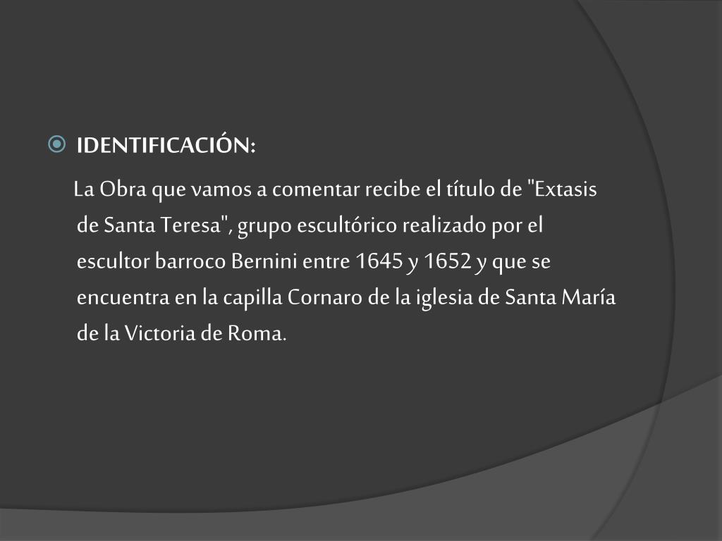 IDENTIFICACIÓN: La Obra que vamos a comentar recibe el título de "Extasis de Santa Teresa", grupo escultórico realizado por el escultor barroco Bernini entre 1645 y 1652 y que se encuentra en la capilla Cornaro de la iglesia de Santa María de la Victoria de Roma.