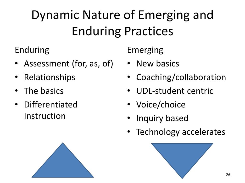 Dynamic Nature of Emerging and Enduring Practices Enduring • Assessment (for, as, of) • Relationships • The basics • Differentiated Instruction Emerging • New basics • Coaching/collaboration • UDL-student centric • Voice/choice • Inquiry based • Technology accelerates