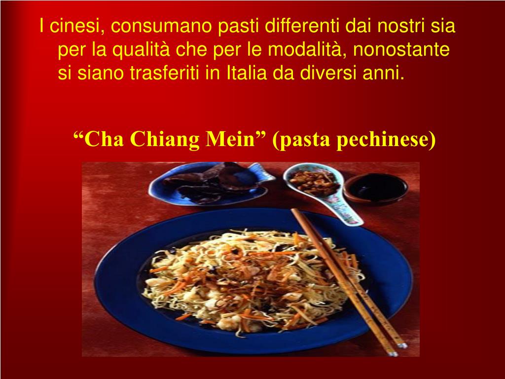 I cinesi, consumano pasti differenti dai nostri sia per la qualità che per le modalità, nonostante si siano trasferiti in Italia da diversi anni. “Cha Chiang Mein” (pasta pechinese) .