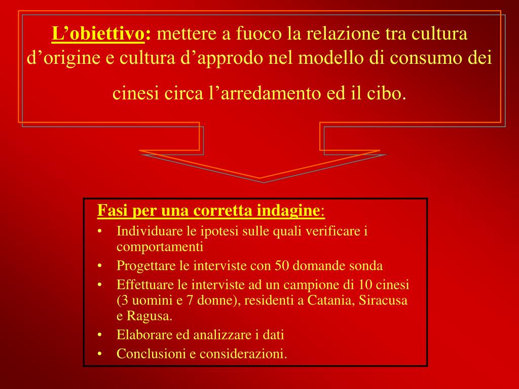 L’obiettivo: mettere a fuoco la relazione tra cultura d’origine e cultura d’approdo nel modello di consumo dei cinesi circa l’arredamento ed il cibo. Fasi per una corretta indagine: • Individuare le ipotesi sulle quali verificare i comportamenti • Progettare le interviste con 50 domande sonda • Effettuare le interviste ad un campione di 10 cinesi (3 uomini e 7 donne), residenti a Catania, Siracusa e Ragusa. • Elaborare ed analizzare i dati • Conclusioni e considerazioni.