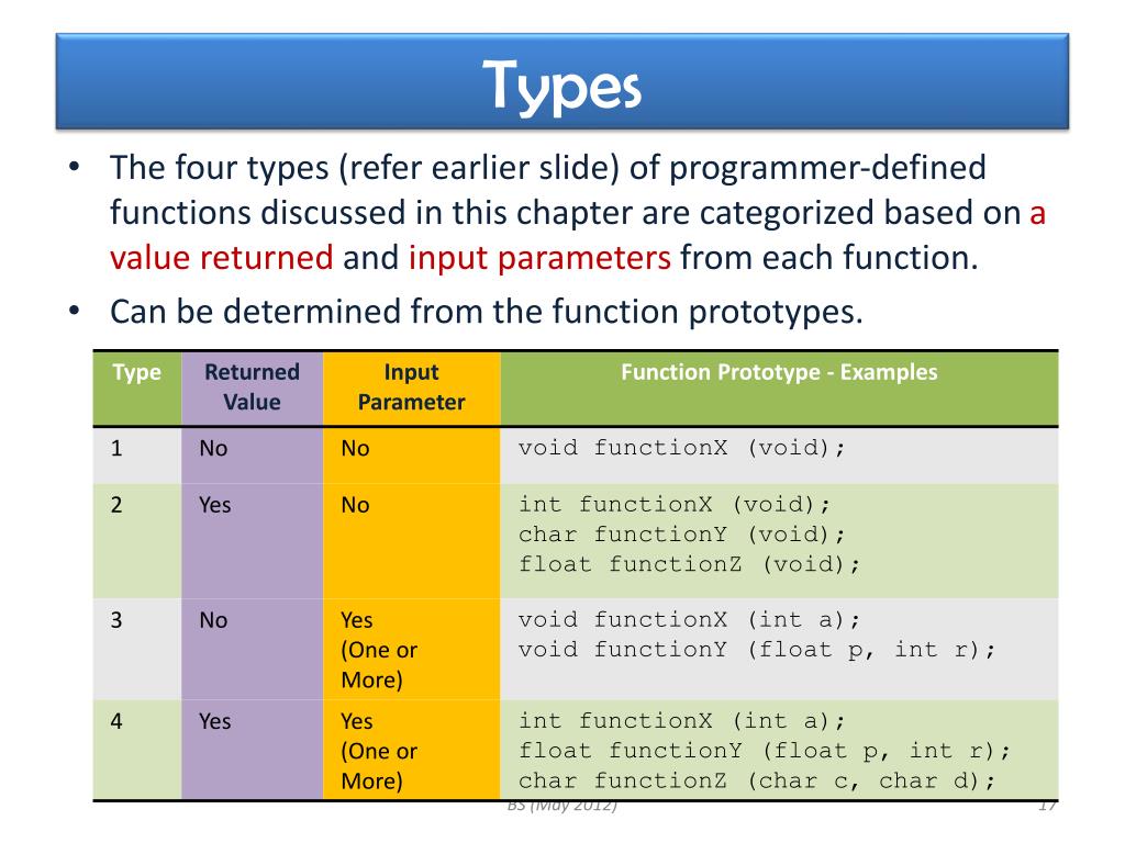 Types • The four types (refer earlier slide) of programmer-defined functions discussed in this chapter are categorized based on a value returned and input parameters from each function. • Can be determined from the function prototypes. BS (May 2012)