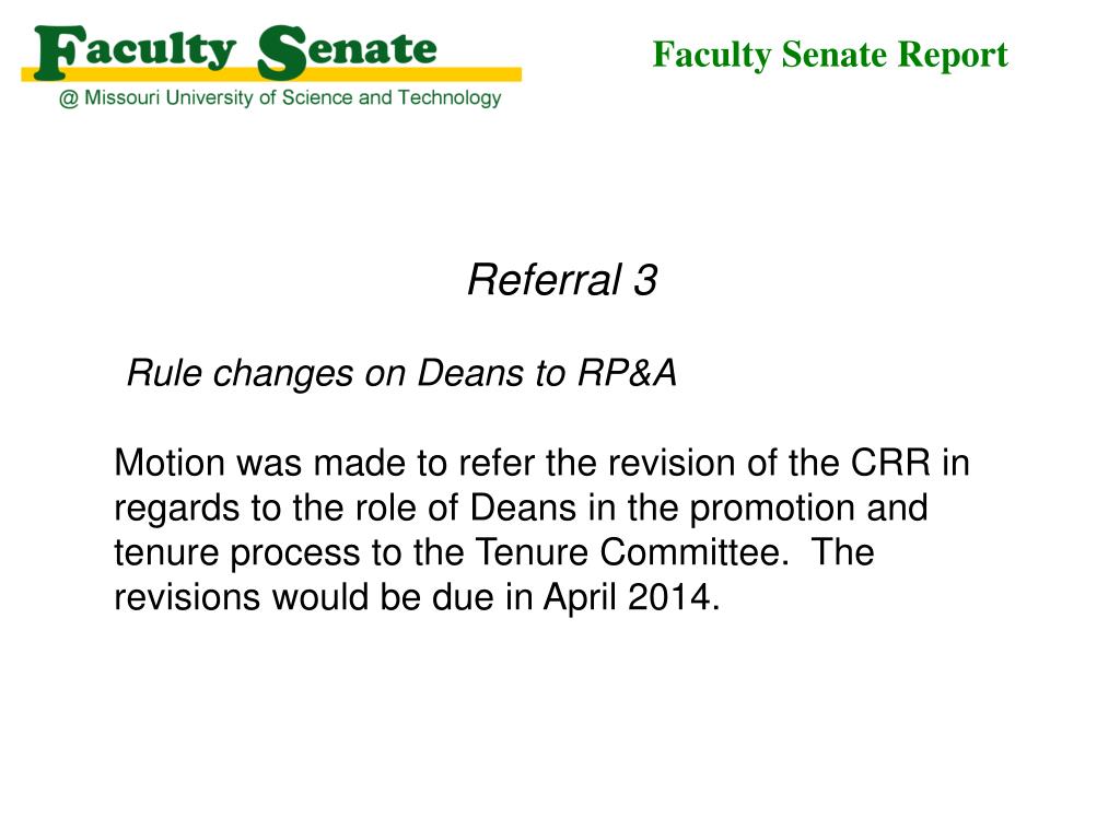 Faculty Senate Report Referral 3 Rule changes on Deans to RP&A Motion was made to refer the revision of the CRR in regards to the role of Deans in the promotion and tenure process to the Tenure Committee. The revisions would be due in April 2014.