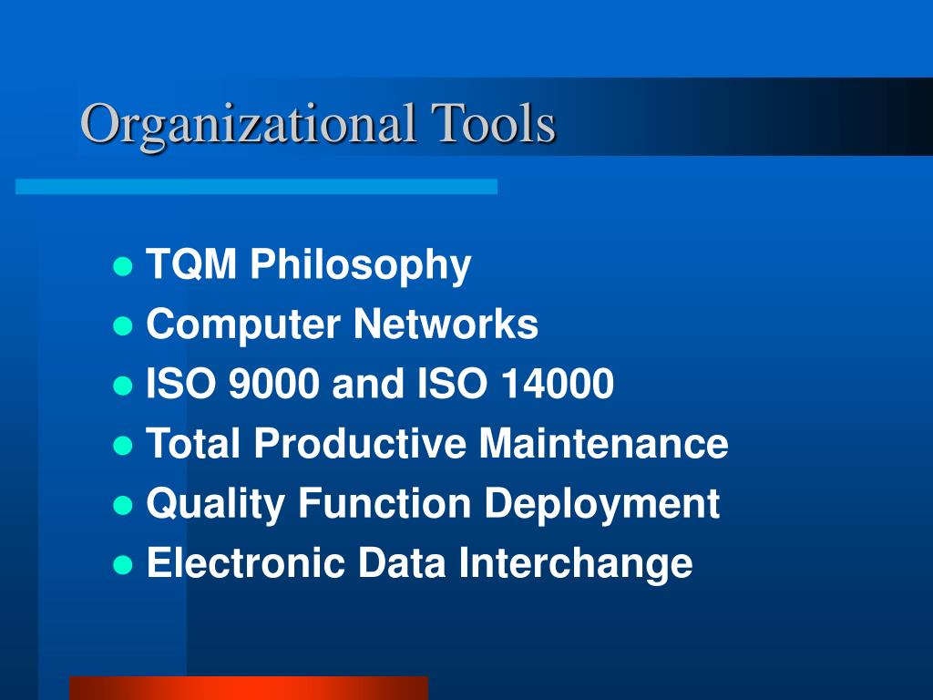 Organizational Tools • TQM Philosophy • Computer Networks • ISO 9000 and ISO 14000 • Total Productive Maintenance • Quality Function Deployment • Electronic Data Interchange