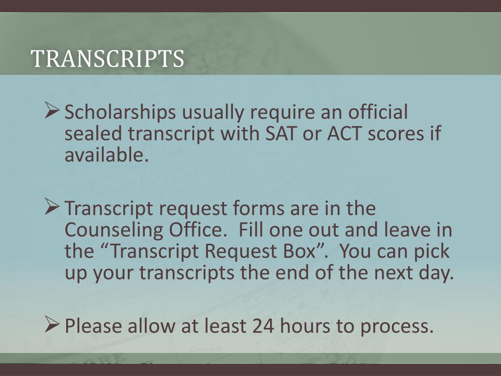 transcripts • Scholarships usually require an official sealed transcript with SAT or ACT scores if available. • Transcript request forms are in the Counseling Office. Fill one out and leave in the “Transcript Request Box”. You can pick up your transcripts the end of the next day. • Please allow at least 24 hours to process.