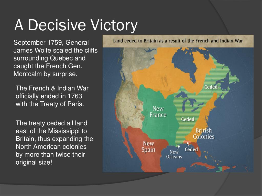 A Decisive Victory September 1759, General James Wolfe scaled the cliffs surrounding Quebec and caught the French Gen. Montcalm by surprise. The French & Indian War officially ended in 1763 with the Treaty of Paris. The treaty ceded all land east of the Mississippi to Britain, thus expanding the North American colonies by more than twice their original size!
