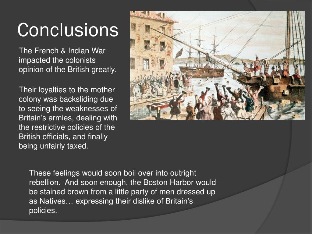 Conclusions The French & Indian War impacted the colonists opinion of the British greatly. Their loyalties to the mother colony was backsliding due to seeing the weaknesses of Britain’s armies, dealing with the restrictive policies of the British officials, and finally being unfairly taxed. These feelings would soon boil over into outright rebellion. And soon enough, the Boston Harbor would be stained brown from a little party of men dressed up as Natives… expressing their dislike of Britain’s policies.