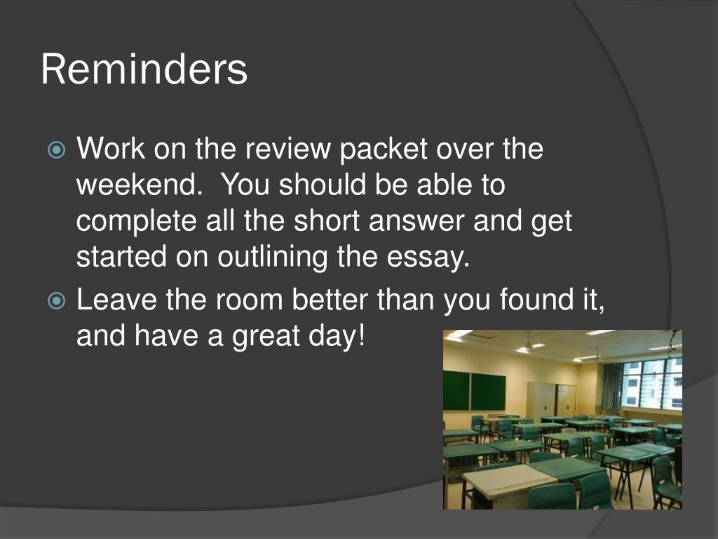Reminders • Work on the review packet over the weekend. You should be able to complete all the short answer and get started on outlining the essay. • Leave the room better than you found it, and have a great day!