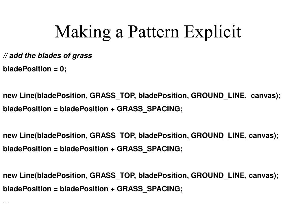 Making a Pattern Explicit // add the blades of grass bladePosition = 0; new Line(bladePosition, GRASS_TOP, bladePosition, GROUND_LINE, canvas); bladePosition = bladePosition + GRASS_SPACING; new Line(bladePosition, GRASS_TOP, bladePosition, GROUND_LINE, canvas); bladePosition = bladePosition + GRASS_SPACING; new Line(bladePosition, GRASS_TOP, bladePosition, GROUND_LINE, canvas); bladePosition = bladePosition + GRASS_SPACING; …