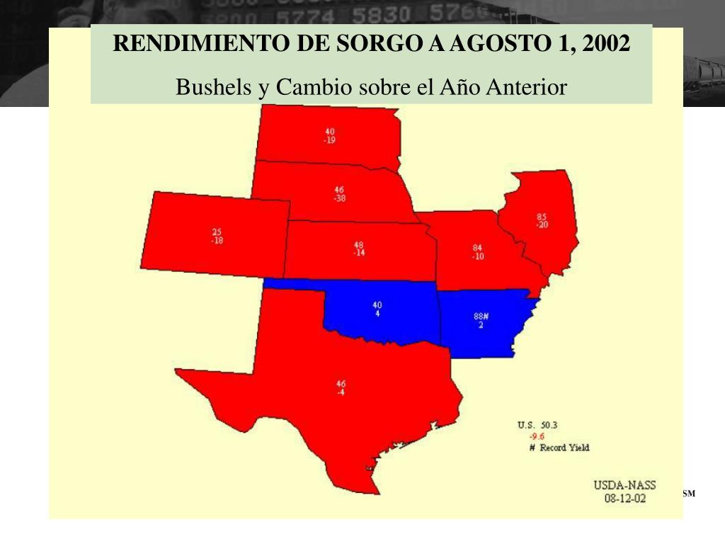 RENDIMIENTO DE SORGO A AGOSTO 1, 2002 Bushels y Cambio sobre el Año Anterior