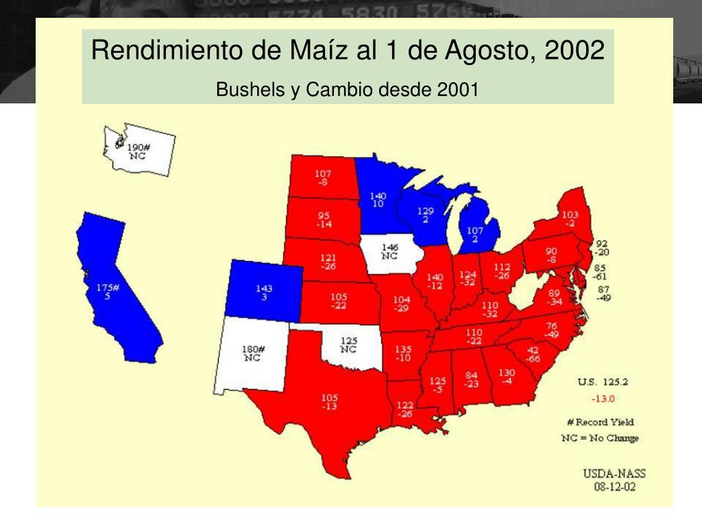 Rendimiento de Maíz al 1 de Agosto, 2002 Bushels y Cambio desde 2001