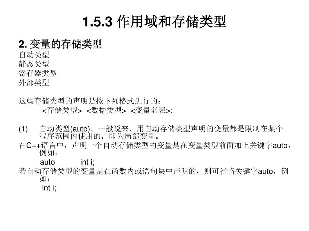 1.5.3 作用域和存储类型 2. 变量的存储类型 自动类型 静态类型 寄存器类型 外部类型 这些存储类型的声明是按下列格式进行的: <存储类型> <数据类型> <变量名表>; • 自动类型(auto)。一般说来,用自动存储类型声明的变量都是限制在某个程序范围内使用的,即为局部变量。 在C++语言中,声明一个自动存储类型的变量是在变量类型前面加上关键字auto,例如: auto int i; 若自动存储类型的变量是在函数内或语句块中声明的,则可省略关键字auto,例如: int i;