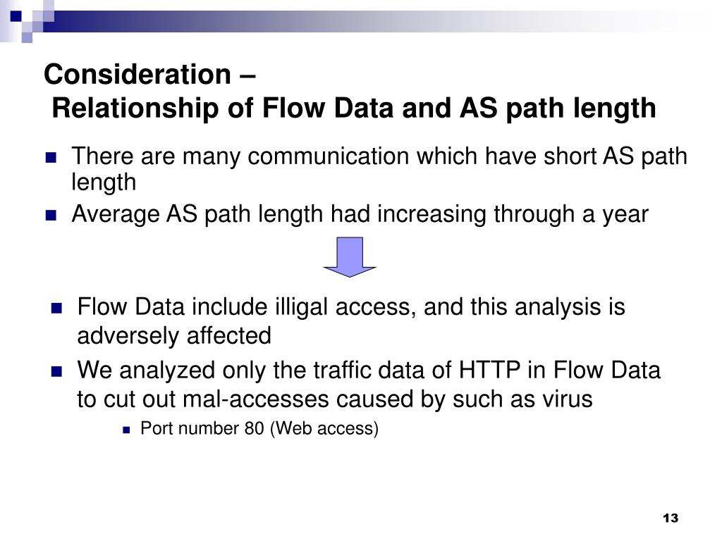 Consideration – Analysis of port80 traffic • Relationship of AS path length and Flow Data • A pair of ASes which have short AS path length communicate frequently • Average AS path length are increasing in all flows • Relationship of Flow Data In port 80 traffic • Average AS-path length that was calculated from length per one flow had been decreased • The number of flows that have shorted AS-path length was increased • AS-path length between ASes that communicates frequently had shortened