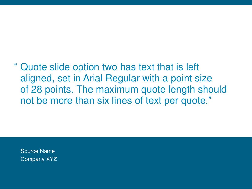 Source Name Company XYZ “ Quote slide option two has text that is left aligned, set in Arial Regular with a point size of 28 points. The maximum quote length should not be more than six lines of text per quote.”