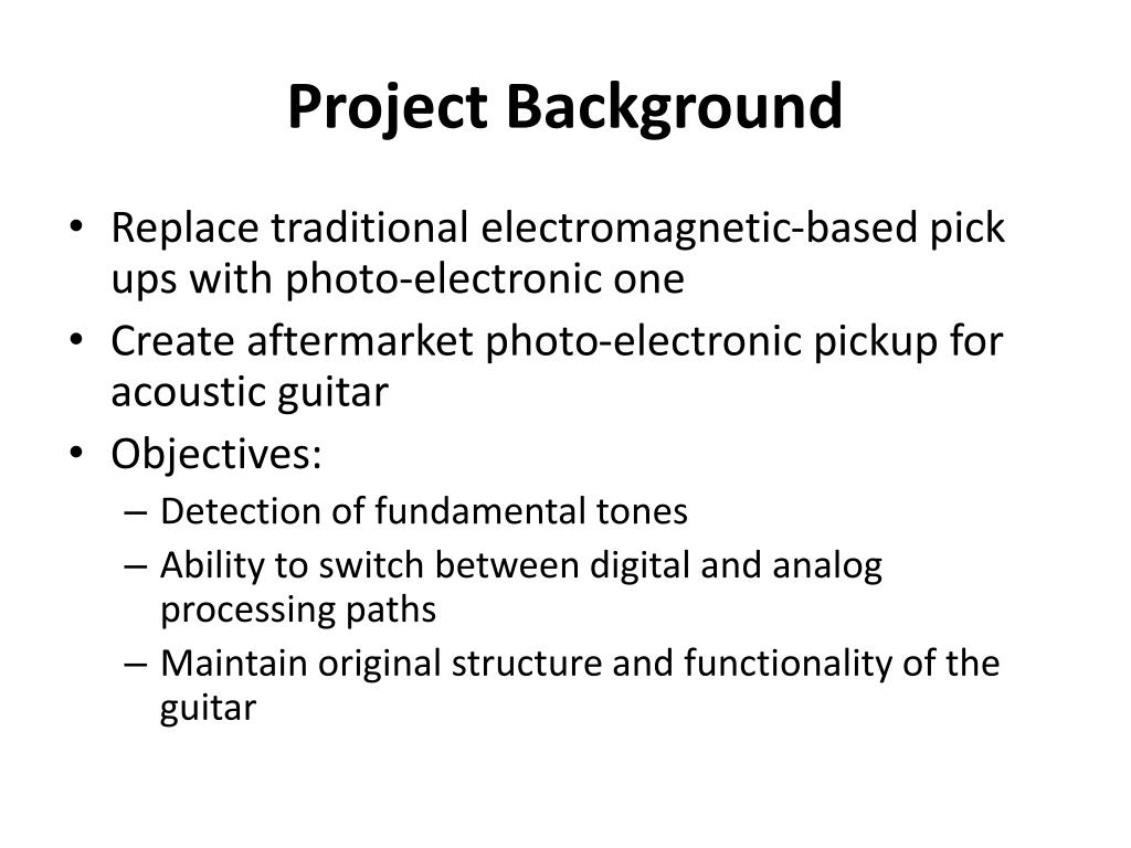 Project Background • Replace traditional electromagnetic-based pick ups with photo-electronic one • Create aftermarket photo-electronic pickup for acoustic guitar • Objectives: • Detection of fundamental tones • Ability to switch between digital and analog processing paths • Maintain original structure and functionality of the guitar