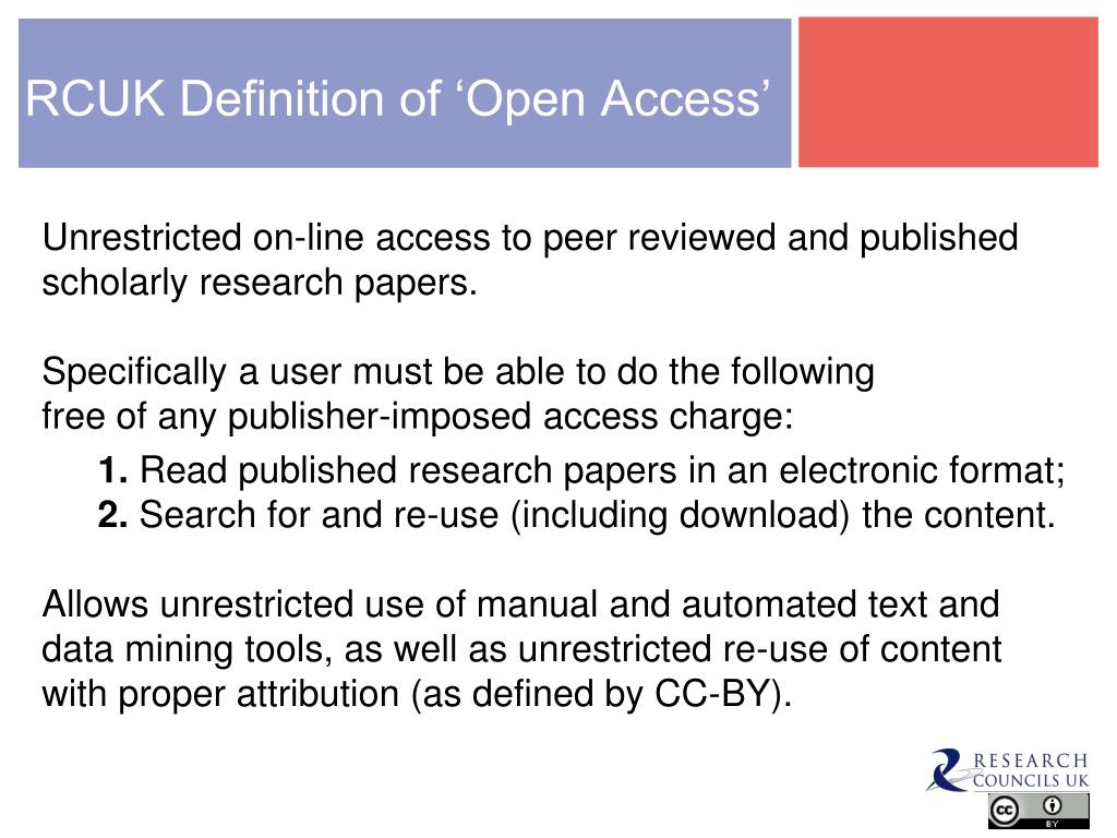 RCUK Definition of ‘Open Access’ • Unrestricted on-line access to peer reviewed and published scholarly research papers. • Specifically a user must be able to do the following • free of any publisher-imposed access charge: • 1. Read published research papers in an electronic format; • 2. Search for and re-use (including download) the content. • Allows unrestricted use of manual and automated text and data mining tools, as well as unrestricted re-use of content with proper attribution (as defined by CC-BY).