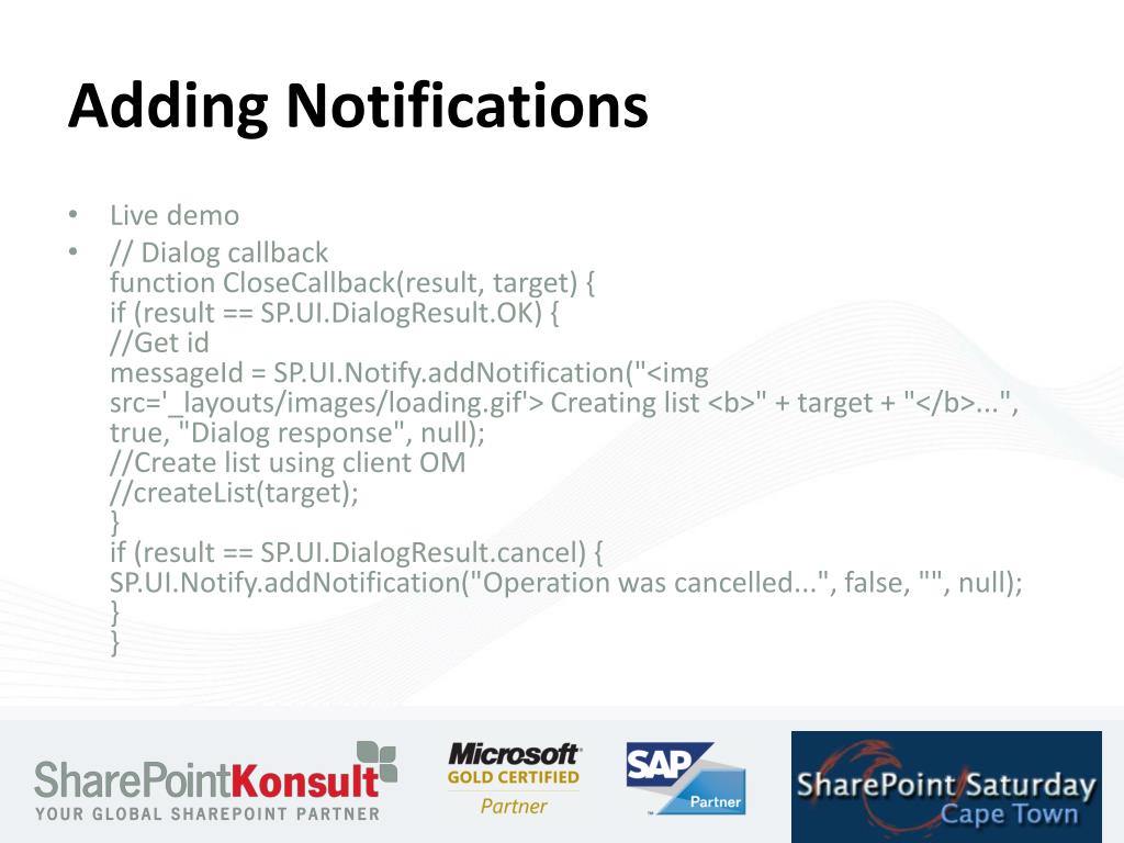Adding Notifications • Live demo • // Dialog callback function CloseCallback(result, target) { if (result == SP.UI.DialogResult.OK) { //Get id messageId = SP.UI.Notify.addNotification("<imgsrc='_layouts/images/loading.gif'> Creating list <b>" + target + "</b>...", true, "Dialog response", null); //Create list using client OM //createList(target);} if (result == SP.UI.DialogResult.cancel) { SP.UI.Notify.addNotification("Operation was cancelled...", false, "", null); } }
