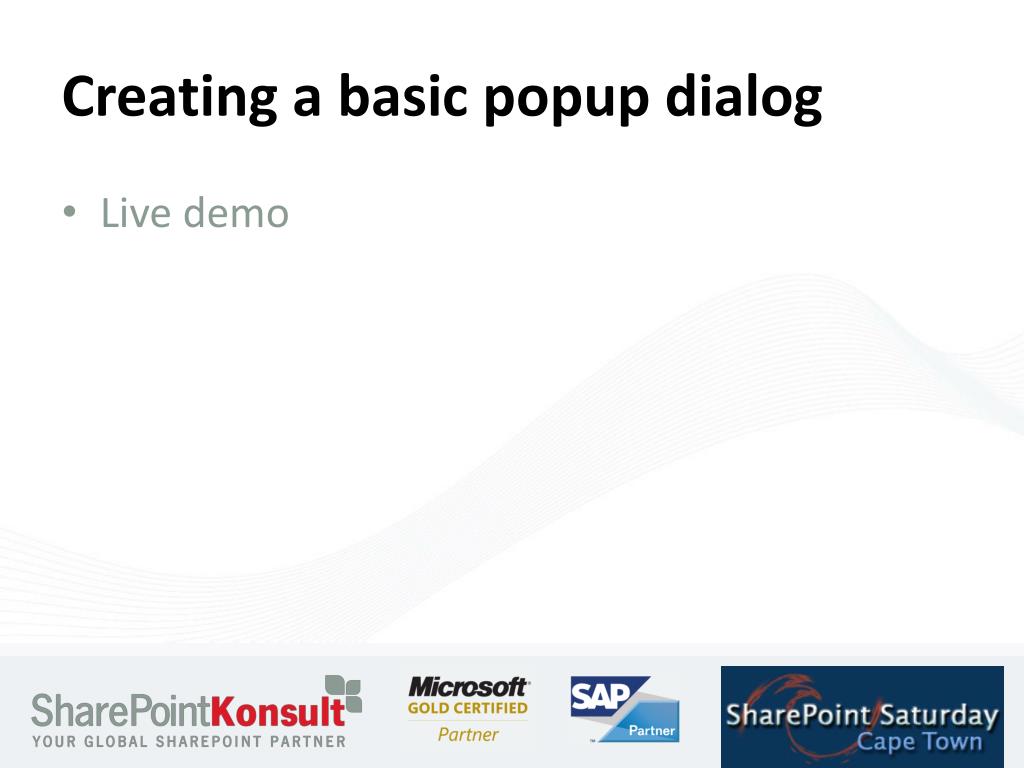 Presentation Agenda • Introduction to SP.UI.ModalDialog Class • Create a basic popup dialog • Dialog Properties • Adding notifications • Use the OM to create a list. • References • Questions