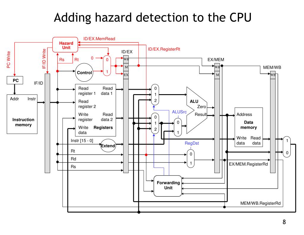 Adding hazard detection to the CPU 0 1 ID/EX.MemRead Hazard Unit ID/EX.RegisterRt ID/EX 0 IF/ID Write Rs Rt 0 1 EX/MEM WB PC Write MEM/WB M WB PC Control EX M WB IF/ID Read register 1 Read data 1 0 1 2 Addr Instr Read register 2 ALU Zero ALUSrc Write register Read data 2 Result Address 0 1 2 Instruction memory 0 1 Data memory Write data Registers Write data Read data Instr [15 - 0] 1 0 RegDst Extend Rt Rd EX/MEM.RegisterRd Rs Forwarding Unit MEM/WB.RegisterRd 8