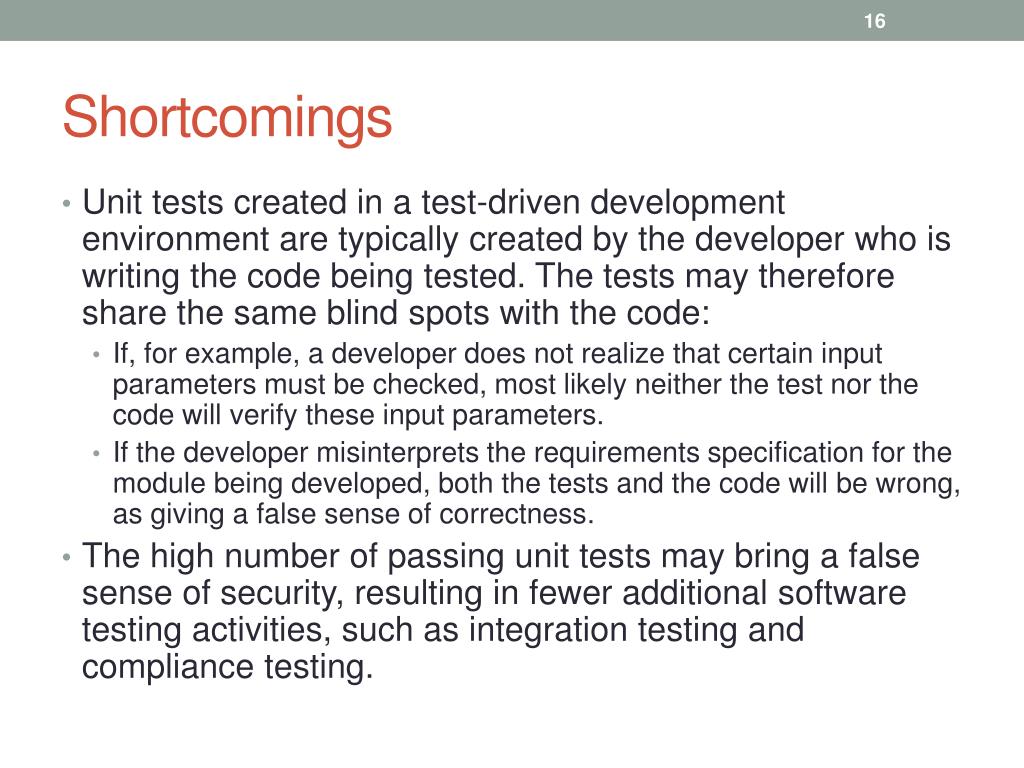 Shortcomings • Unit tests created in a test-driven development environment are typically created by the developer who is writing the code being tested. The tests may therefore share the same blind spots with the code: • If, for example, a developer does not realize that certain input parameters must be checked, most likely neither the test nor the code will verify these input parameters. • If the developer misinterprets the requirements specification for the module being developed, both the tests and the code will be wrong, as giving a false sense of correctness. • The high number of passing unit tests may bring a false sense of security, resulting in fewer additional software testing activities, such as integration testing and compliance testing.