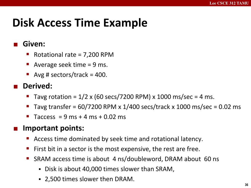 Disk Access Time • Average time to access some target sector approximated by : • Taccess = Tavg seek + Tavg rotation + Tavg transfer • Seek time (Tavg seek) • Time to position heads over cylinder containing target sector. • Typical Tavg seek is 9 ms • Rotational latency (Tavg rotation) • Time waiting for first bit of target sector to pass under r/w head. • Tavg rotation = 1/2 x 1/RPMs x 60 sec/1 min • Typical Tavg rotation = 7200 RPMs • Transfer time (Tavg transfer) • Time to read the bits in the target sector. • Tavg transfer = 1/RPM x 1/(avg # sectors/track) x 60 secs/1 min.
