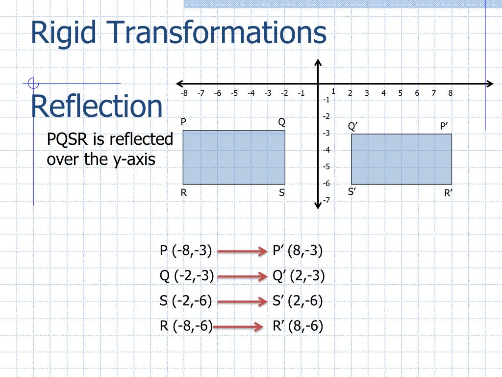 Rigid TransformationsReflection P Q 1 -8 -7 -6 -5 -4 -3 -2 -1 2 3 4 5 6 7 8 -1 -2 R S PQSR is reflected over the y-axis -3 -4 -5 Q’ P’ -6 -7 S’ R’ P (-8,-3) Q (-2,-3) S (-2,-6) R (-8,-6) P’ (8,-3) Q’ (2,-3) S’ (2,-6) R’ (8,-6)