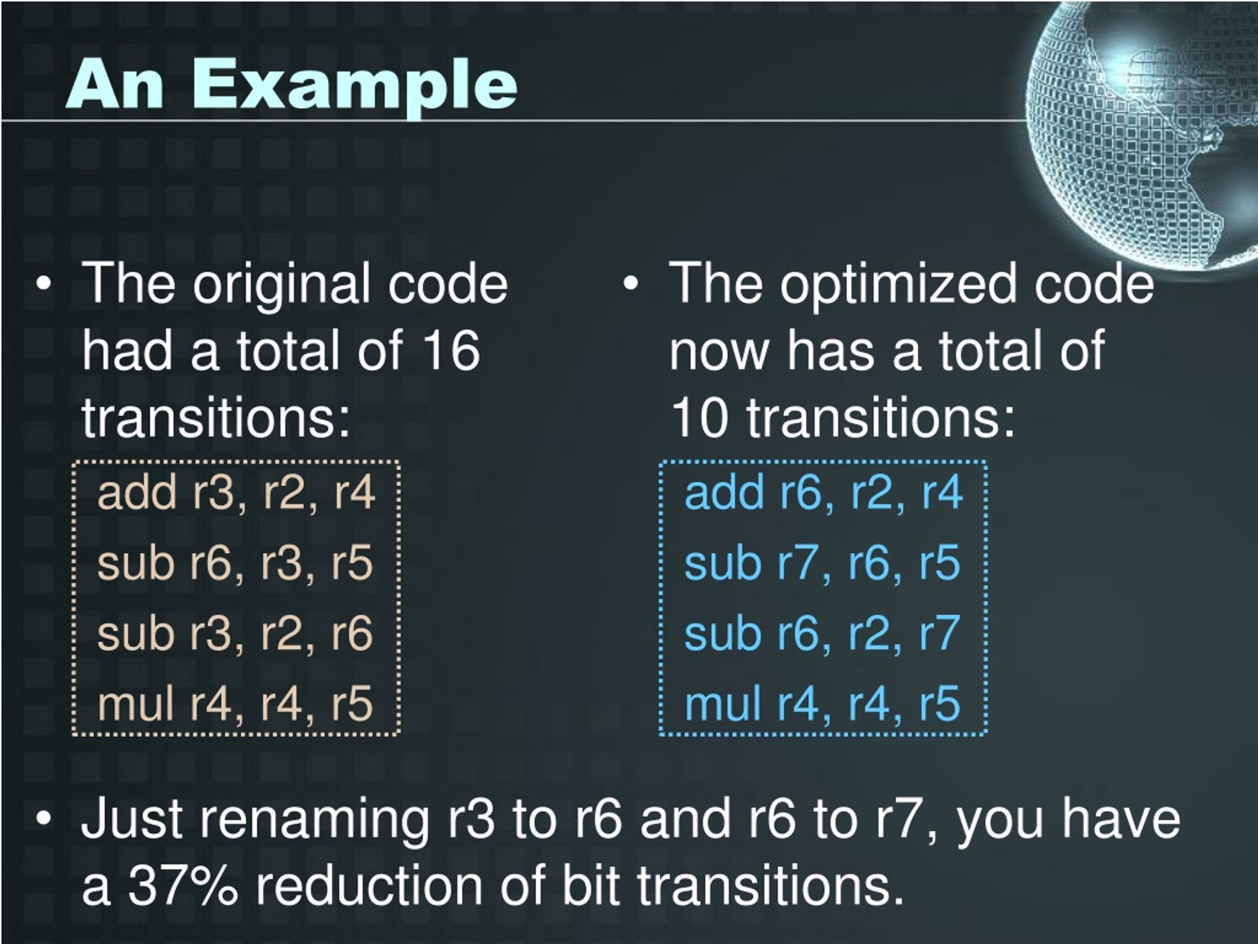 An Example • The original code had a total of 16 transitions: add r3, r2, r4 sub r6, r3, r5 sub r3, r2, r6 mul r4, r4, r5 • The optimized code now has a total of 10 transitions: • add r6, r2, r4 • sub r7, r6, r5 • sub r6, r2, r7 • mul r4, r4, r5 • Just renaming r3 to r6 and r6 to r7, you have a 37% reduction of bit transitions.