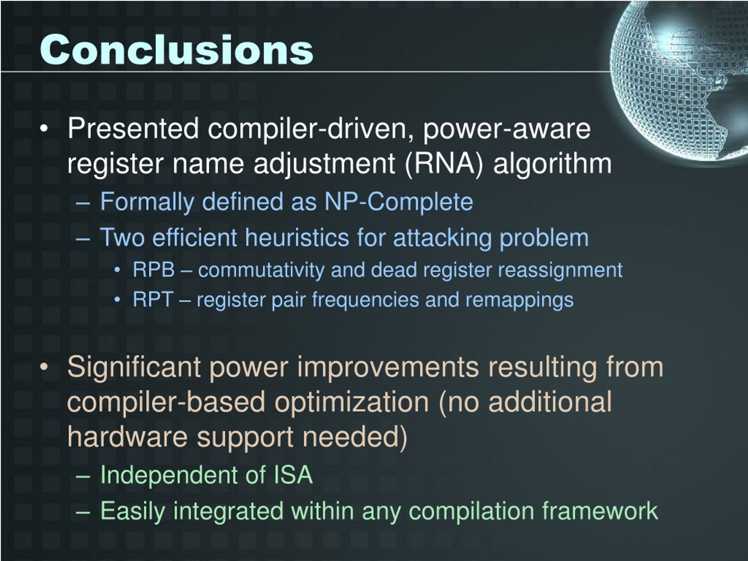Conclusions • Presented compiler-driven, power-aware register name adjustment (RNA) algorithm • Formally defined as NP-Complete • Two efficient heuristics for attacking problem • RPB – commutativity and dead register reassignment • RPT – register pair frequencies and remappings • Significant power improvements resulting from compiler-based optimization (no additional hardware support needed) • Independent of ISA • Easily integrated within any compilation framework