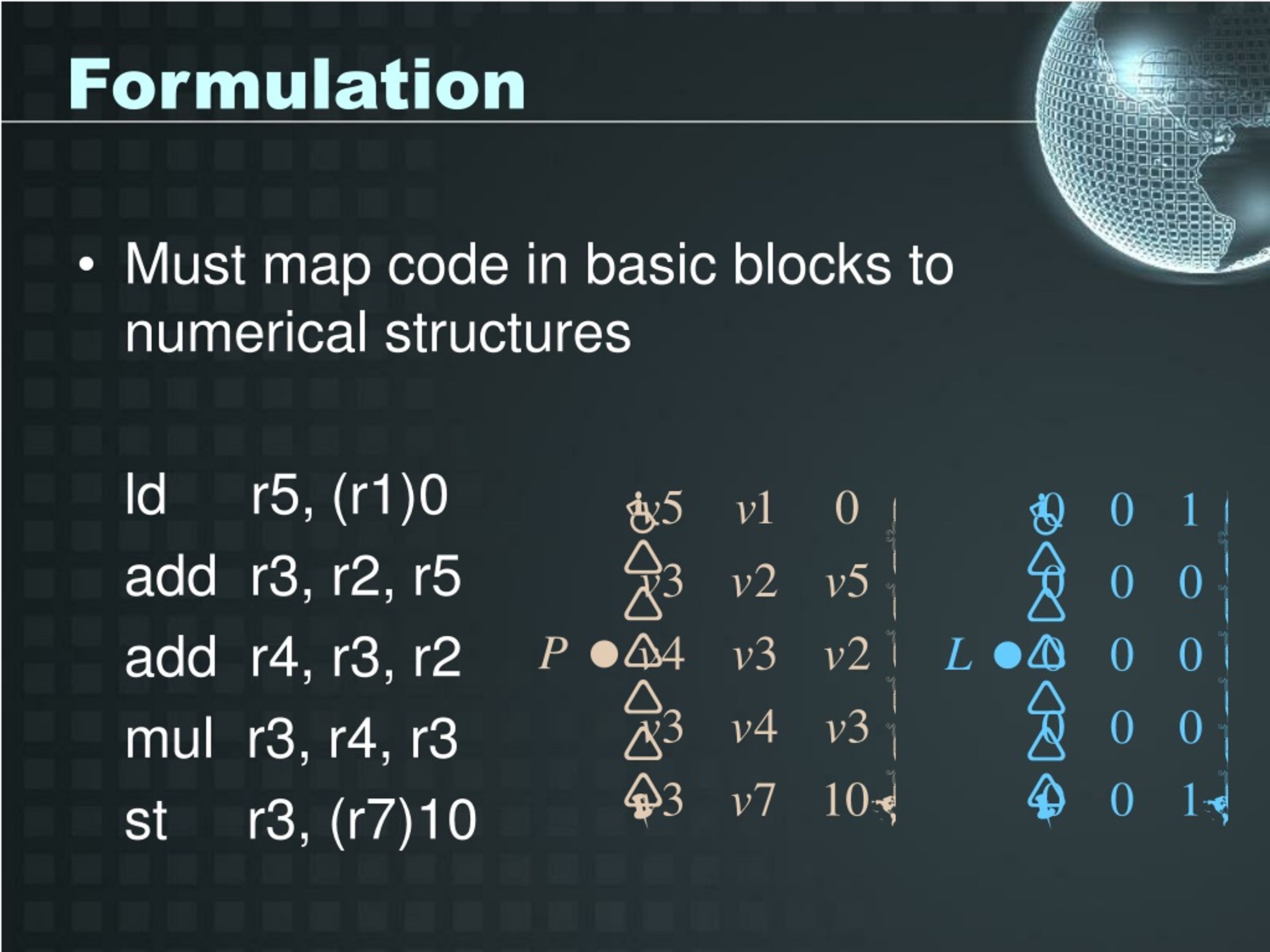 Formulation • Must map code in basic blocks to numerical structures ld r5, (r1)0 add r3, r2, r5 add r4, r3, r2 mul r3, r4, r3 st r3, (r7)10
