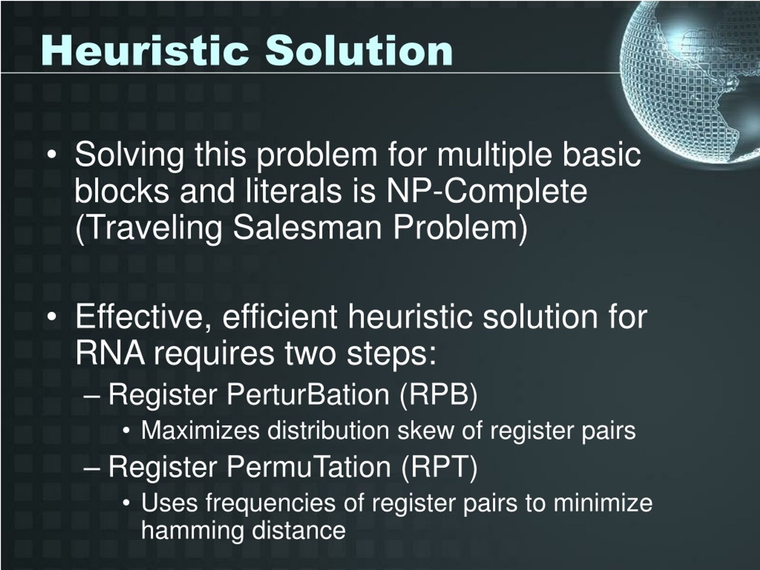 Heuristic Solution • Solving this problem for multiple basic blocks and literals is NP-Complete (Traveling Salesman Problem) • Effective, efficient heuristic solution for RNA requires two steps: • Register PerturBation (RPB) • Maximizes distribution skew of register pairs • Register PermuTation (RPT) • Uses frequencies of register pairs to minimize hamming distance